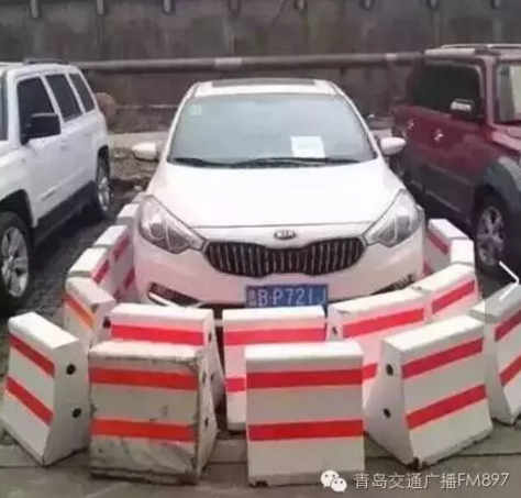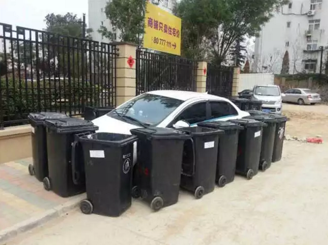 青島一私家車“搶地盤” 被16個(gè)垃圾桶包圍