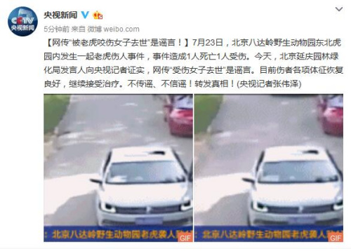 【網(wǎng)傳“被老虎咬傷女子去世”是謠言!】7月23日,北京八達(dá)嶺野生動物園東北虎園內(nèi)發(fā)生一起老虎傷人事件,事件造成1人死亡1人受傷。今天,北京延慶園林綠化局發(fā)言人向央視記者證實(shí),網(wǎng)傳“受傷女子去世”是謠言。目前傷者各項(xiàng)體征恢復(fù)良好,繼續(xù)接受治療。不傳謠、不信謠!轉(zhuǎn)發(fā)真相!(央視記者張偉澤)