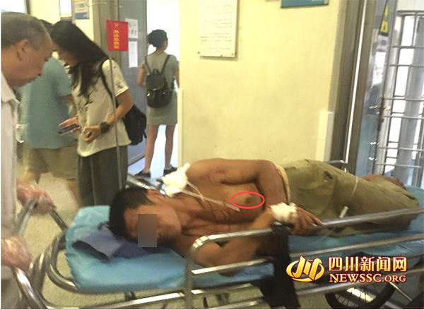 今日中午11點(diǎn)過,四川新聞網(wǎng)記者趕到省醫(yī)院急診科看到,都師傅剛從CT室做完檢查,在他的左肩胛部仍能看到一小截鋼筋,在他的正面前胸處可以看到鋼筋的另一頭,但沒有刺穿。他側(cè)臥在病床上,睜著眼睛,沒有說話。