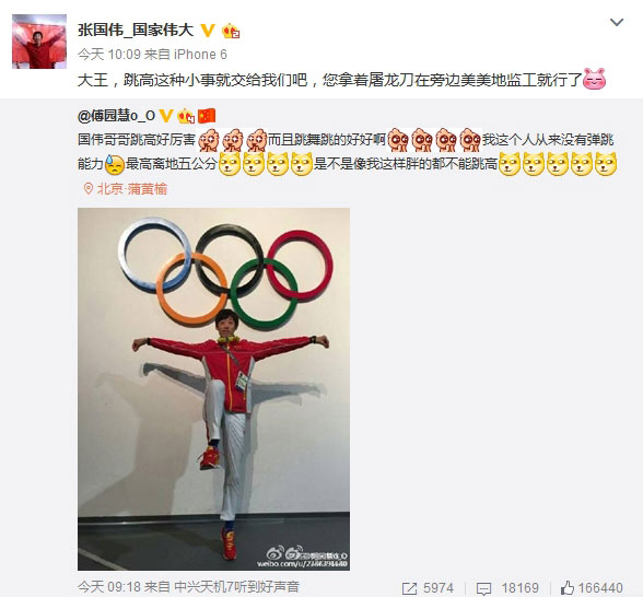盡管這條微博沒有@張國偉,但是他還是回復了:“大王,跳高這種小事就交給我們吧,您拿著屠龍刀在旁邊美美地監(jiān)工就行了!睆垏鴤セ貜偷摹按笸豕!眮碜杂诖饲案祱@慧的微博,她自我調侃是大王。
