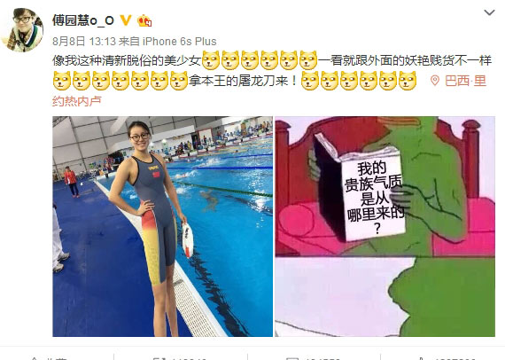 北京時間8月18日,洪荒少女傅園慧的偶像是誰?我們可以從她微博中看出來,至少其中之一是跳高選手張國偉。回國的洪荒少女和“泥石流”今天在微博上互動了!