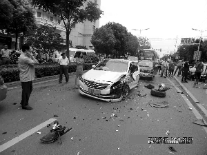 據(jù) 句容交警大隊(duì)介紹,事發(fā)時(shí),孔某(男,48歲,句容人)駕駛黑色大眾小轎車,沿句容市區(qū)文昌東路由西向東的方向行駛至事發(fā)路段時(shí),突然駛?cè)氲缆纷髠?cè)并越過(guò) 中心線,與對(duì)面正常交會(huì)行駛的白色現(xiàn)代小型轎車碰撞并反彈波及其他車輛,共造成4輛小車受損(其中兩車受損嚴(yán)重)、2名駕駛?cè)耸茌p傷。隨后,孔某趁現(xiàn)場(chǎng)人 多雜亂,棄車離開。