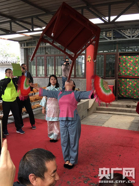 劉文昌的家人在表演用下巴舉桌子(央廣網(wǎng)記者張穎 攝)