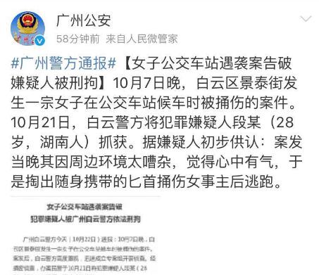 原標題:女子公交車站遇襲案告破 疑犯稱因周邊太嘈心中有氣