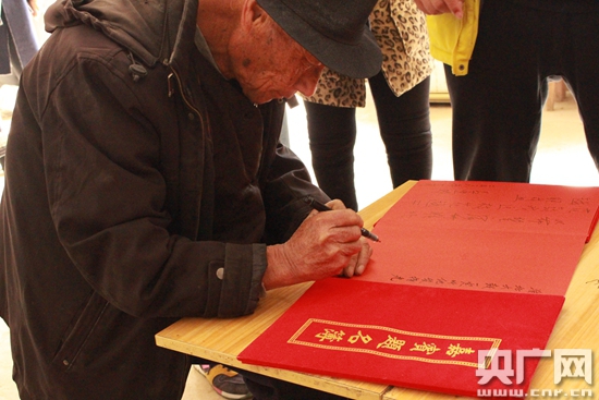 周明漢寫下對(duì)于淮北大鼓未來發(fā)展的希冀(央廣網(wǎng)記者 孫永政 攝)