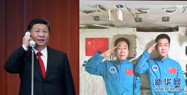 11月9日下午16時20分,中共中央總書記、國家主席、中央軍委主席習近平走進中國載人航天工程指揮中心,在指揮席就座。他注視著大屏幕,仔細觀看景海鵬、陳冬兩位航天員在天宮二號內的試驗操作。16時25分,景海鵬、陳冬到視頻通話位置并排站立,天地對話開始。