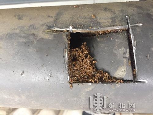 鋼管內(nèi)被填充滿了潮濕的沙子。東北網(wǎng)記者 孫英鑫 攝。