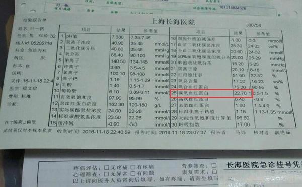 而根據(jù)網(wǎng)友在網(wǎng)上公布的一份長海醫(yī)院化驗報告顯示,左下角報告時間顯示為11月18日23時15分。報告數(shù)值顯示,檢測對象碳氧血紅蛋白為21.10,高于參考值0.5至1.5,明顯高于參考值。