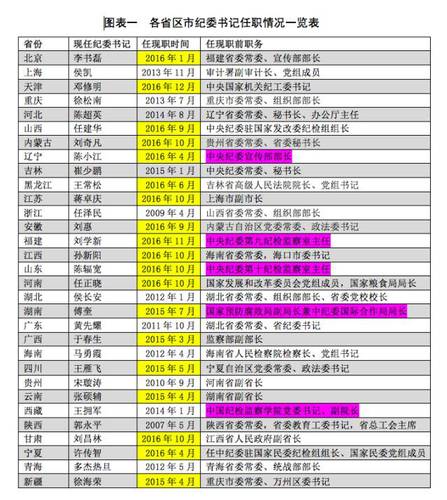 由此可見,2015年3月以來新任的19名省級紀委書記(圖表一中標注黃色者),都是按照《。ㄗ灾螀^(qū)、直轄市)紀委書記、副書記提名考察辦法(試行)》的要求選任的,提名以中央紀委會同中央組織部為主,既可以從紀檢監(jiān)察系統(tǒng)內(nèi)部也可以在系統(tǒng)外產(chǎn)生提名人選。在19人中,鄧修明、任建華、陳小江、劉惠、劉學新、陳輻寬、傅奎、于春生、許傳智等9人曾有過紀檢監(jiān)察機關(guān)任職履歷;而其余10人則從無紀檢監(jiān)察崗位任職經(jīng)歷,為系統(tǒng)外提名產(chǎn)生,兩者的比例恰好大致各占了一半。從人選任現(xiàn)職前的職務(wù)來看,符合《提名考察辦法》規(guī)定的要求,全部為交流任職。