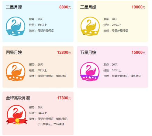 一家生活服務平臺公開的月嫂價格顯示,在北京提供26天服務,二星月嫂需要8800元,三星月嫂10800元,四星月嫂12800元,五星月嫂15800元,最高級別的金牌高級月嫂則要17800元。