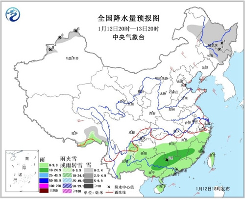 全國(guó)降水量預(yù)報(bào)圖(1月12日20時(shí)-13日20時(shí))