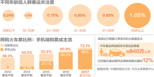 最關(guān)注春運的是什么人?按照鐵總與今日頭條聯(lián)合發(fā)布的數(shù)據(jù)報告,50歲以上人群相較其他年齡段更關(guān)注春運。這個結(jié)果與社會的普遍印象不同,人們似乎更傾向于認為,外出的求學者和就業(yè)者是形成春運的主要成因,而50歲以上人群顯然不是這兩個人群的主力。