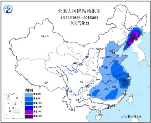 受較強(qiáng)冷空氣影響,29日至30日,東北地區(qū)中南部、華北中東部、黃淮、江淮、江漢中東部、江南、華南北部、貴州中東部等地的日平均氣溫或最低氣溫將下降6~10℃,其中,吉林中東部、遼寧東北部等地的局地降溫幅度可達(dá)14℃以上,上述地區(qū)將伴有4~6級(jí)風(fēng),東部海區(qū)有7~8級(jí)風(fēng),陣風(fēng)9級(jí)。中央氣象臺(tái)1月29日06時(shí)繼續(xù)發(fā)布大風(fēng)降溫預(yù)報(bào)。