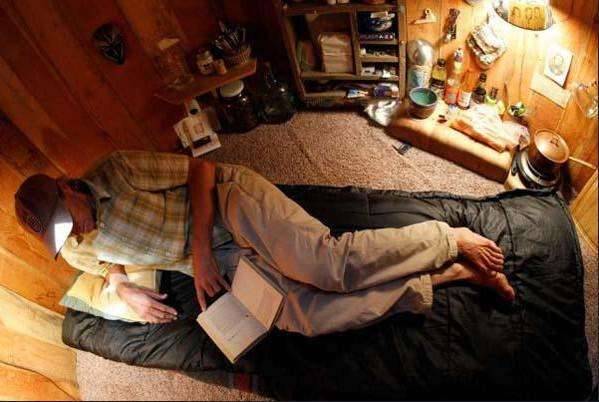里面的墻壁上掛滿了生活的日常用具,有鍋碗瓢盆,油鹽醬醋,看上去就是一個(gè)小廚房一樣,在最里面還放了一張床。整個(gè)小屋子里面居然還有電燈,小屋的主人正在里面看著書。