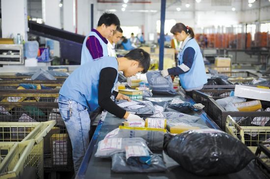 工作人員分配電子商務(wù)快遞包裹。(圖片來自網(wǎng)絡(luò))
