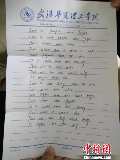 該男生名叫周鶴齡,為了寫好這34份書信,他上網(wǎng)查找大量資料,還在圖書館翻閱書籍,花了3天時間完工。他說:“我在參考英文詩歌的基礎(chǔ)上再原創(chuàng),盡量嘗試用不同的方式去表達(dá),希望每一封信都能準(zhǔn)確地傳達(dá)出我的想法”。每封信件用信封裝著,英文字體清秀,字里行間流露出周鶴齡對女同學(xué)們的祝愿、祝福。
