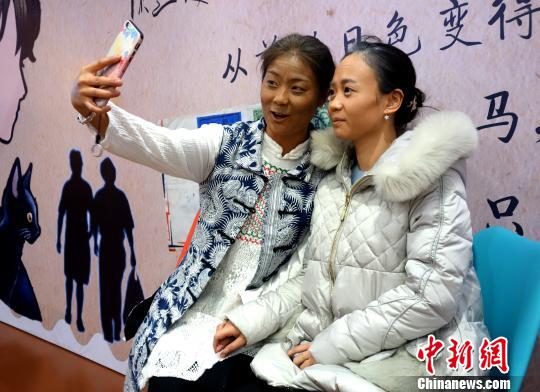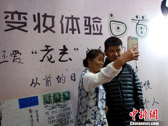 變妝后的兩位“老人”用手機拍下自己“老去”的模樣。 孫睿 攝