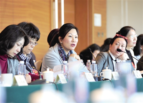 3月7日上午,全國(guó)政協(xié)婦聯(lián)界別翟美卿委員(中)在小組討論中建議要加快信用體系建設(shè),只有堅(jiān)持誠(chéng)信為本,市場(chǎng)才能更加公開公平公正。本報(bào)記者 高興貴攝