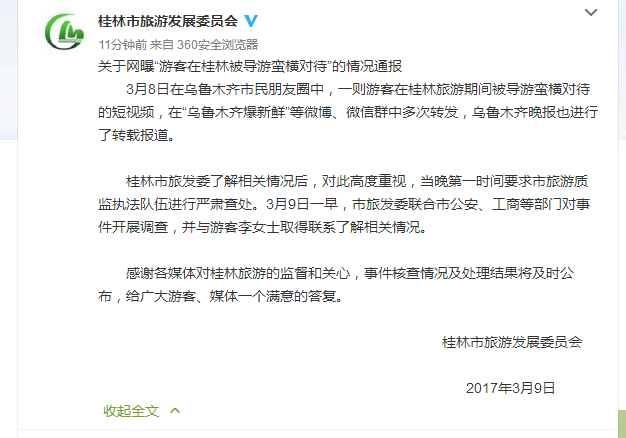 3月9日下午,桂林市旅游發(fā)展委員會(huì)官方回應(yīng)稱,已要求市旅游質(zhì)監(jiān)執(zhí)法隊(duì)伍、市公安、工商等部門開展調(diào)查,核查情況及處理結(jié)果將及時(shí)公布。