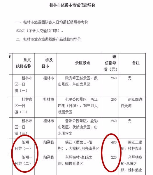 “此刻”注意到,2016年12月27日,桂林市旅行社協(xié)會(huì)發(fā)布了《桂林市旅行社投訴處理辦法》(試行)。同時(shí),桂林市旅游發(fā)展委員會(huì)在其官方主頁(yè)上公布了16條旅游線路的誠(chéng)信指導(dǎo)價(jià)。涉及陽(yáng)朔的8條線路中有兩條為一日游,指導(dǎo)價(jià)分別為480元和220元,是李女士參繳納團(tuán)費(fèi)的5倍還多。