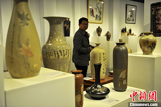 資料圖:2016年3月10日,“千年建水紫陶——名家名品展”在昆明陶韻文化藝術(shù)館展出。圖為展出的紫陶藝術(shù)品。中新社記者 任東 攝