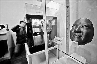昨天下午,北京青年報(bào)記者來(lái)到3D打印工作室,發(fā)現(xiàn)里頭并沒(méi)有想象中的復(fù)雜,15平方米左右的工作間內(nèi),東側(cè)一排桌子上放著兩臺(tái)電腦,與南側(cè)靠墻位置的一臺(tái)3D打印機(jī)相連,西側(cè)放著1個(gè)陳列柜,里頭陳列著十來(lái)個(gè)大小不一的成品,有的是剛剛打印出來(lái)的模子,有的則貼上了硅膠并畫(huà)上妝容。個(gè)別成品乍一看還真以為是一張“人臉”。