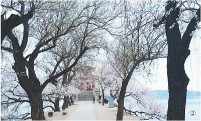 在這座充滿古韻的皇家園林中,陽光明媚,湖水清清,桃紅柳綠,生機勃勃,真可謂“十里桃花”(圖②,王若凈攝)。滿園春色吸引了眾多游客,沉醉花香,流連忘返。