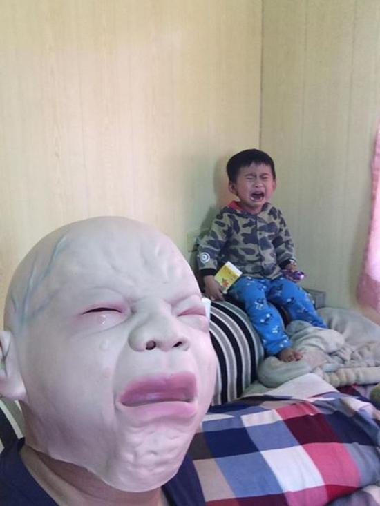 曾姓父親在facebook專頁“爆廢公社”上傳照片,他戴著的面具表情猙獰,光禿的頭頂還爆現(xiàn)青筋,看上去令人毛骨悚然,難怪把兒子嚇哭。這位爸爸還狡辯說兒子根本不怕,哭鬧只因?yàn)橐缢,他不給喝飲料和吃糖果。