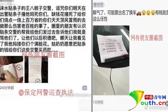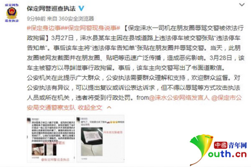 中國(guó)青年網(wǎng)北京3月29日電(記者 李永鵬 見(jiàn)習(xí)記者 劉利影)近日,河北省保定市淶水縣某車主因3月26日在縣城道路上違法停車,被值勤民警張貼“違法停車告知單”。事后,該車主將“違法停車告知單”配以辱罵性的文字在“朋友圈”發(fā)布并號(hào)召他人轉(zhuǎn)發(fā)。3月28日,該車主因?qū)め呑淌卤痪叫姓辛。事后,該車主寫出了?shū)面道歉信。