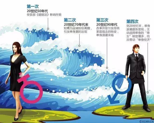 中國內(nèi)地曾經(jīng)出現(xiàn)過幾次單身潮。第一次是在20世紀(jì)50年代,首部《婚姻法》帶來了全國的離婚潮;20世紀(jì)70年代末,知青為了返城紛紛離婚,引發(fā)了第二次單身潮的出現(xiàn);20世紀(jì)90年代以來,改革開放引發(fā)傳統(tǒng)家庭觀念的轉(zhuǎn)變,第三次單身浪潮來臨; 到現(xiàn)在,隨著經(jīng)濟的飛速發(fā)展和女性自主意識的提升,第四次單身浪潮逐漸顯現(xiàn)。