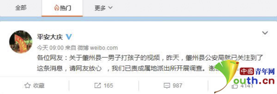 中國青年網(wǎng)北京4月1日電(記者 李永鵬 見習(xí)記者 劉利影)近日,一段男子不斷掌摑、毆打女童的視頻在網(wǎng)上流傳,引發(fā)網(wǎng)民關(guān)注。有網(wǎng)友稱,視頻拍攝地為大慶市肇州縣。4月1日上午9時,大慶市公安局官方微博發(fā)布消息稱,肇州縣公安局已關(guān)注到相關(guān)視頻,并責(zé)成屬地派出所開展調(diào)查。