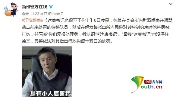 中國(guó)青年網(wǎng)北京4月10日電 據(jù)微博認(rèn)證為“安徽省阜陽(yáng)市潁州公安分局”的賬號(hào)@潁州警方在線發(fā)布消息稱,8日凌晨,徐某在某會(huì)所內(nèi)醉酒鬧事并謾罵襲擊前來(lái)處置的特警隊(duì)員,隨后在解放路派出所內(nèi)民警對(duì)其控制約束時(shí)他將民警打傷,并高喊“你們無(wú)權(quán)處理我,我認(rèn)識(shí)‘李達(dá)康書(shū)記’!