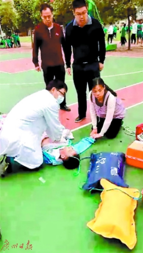到了現(xiàn)場(chǎng),歐杏妹趕緊蹲下,發(fā)現(xiàn)學(xué)生胸口已沒有起伏,一摸頸部主動(dòng)脈,也沒有搏動(dòng)了。意識(shí)到情況的嚴(yán)重性,她用聽筒器一聽,心臟也完全沒有了跳動(dòng)!爱(dāng)時(shí)正是大課間,籃球場(chǎng)上都是跑操的學(xué)生。學(xué)生突發(fā)暈倒之后,學(xué)校馬上啟動(dòng)應(yīng)急預(yù)案,現(xiàn)場(chǎng)老師通力合作,撥打120急救電話,并把學(xué)生帶回課室!痹撔O嚓P(guān)負(fù)責(zé)人屈老師告訴記者,這樣做一是為了減少對(duì)學(xué)生心理的沖擊,二是避免學(xué)生圍觀,干擾急救。