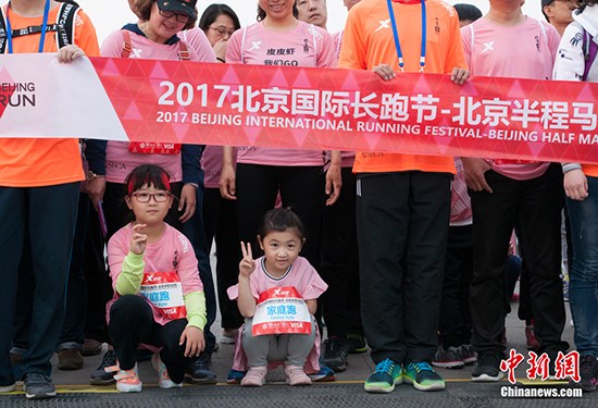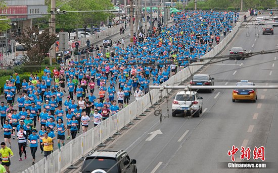 中新網北京4月16日電(岳川) 2017北京國際長跑節(jié)暨北京半程馬拉松(“北京跑”)于16日早晨鳴槍起跑,約兩萬名跑者參賽其中。
