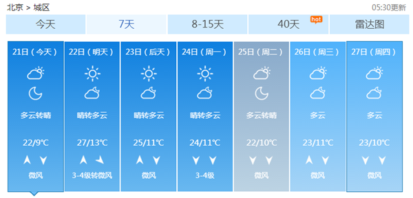 中國天氣網(wǎng)訊 今天(21日)北京多云為主,最高氣溫22℃,明天晴到多云,最高氣溫將回升至27℃。本周末北京都將是晴到多云為主的好天氣,適宜戶外活動。但天氣干燥,白天紫外線照射強(qiáng),需注意補(bǔ)水潤燥及遮陽防曬。