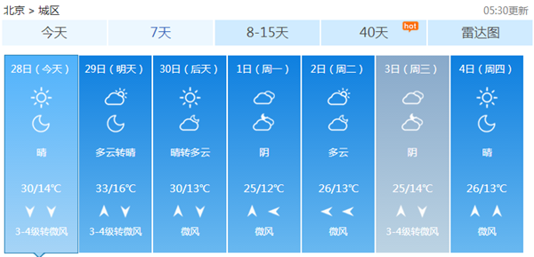 今天,北京依然晴天為主,氣溫繼續(xù)走高。北京市氣象臺(tái)6時(shí)發(fā)布天氣預(yù)報(bào):今天白天晴間多云,北風(fēng)一二級(jí)轉(zhuǎn)三四級(jí),最高氣溫30℃;夜間晴,北風(fēng)二級(jí)左右,最低氣溫15℃。