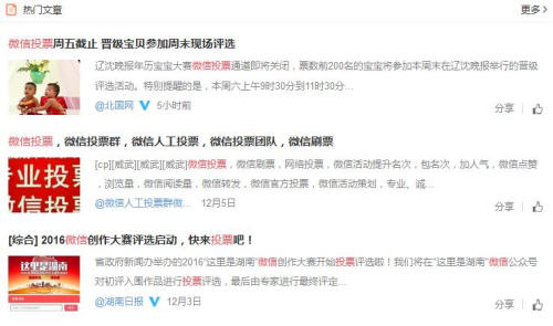 求贊拉票本來是在拼人氣,但也成為一些人的煩惱。為了在“票”數(shù)上一決雌雄,求贊票者不遺余力,撒錢拉人獎品引誘,各顯其能。對于接受“點贊”任務的朋友們,礙于情面,不論事實怎樣,動動拇指做個順水人情,但時間久了,也是惹人煩、不勝其擾?梢哉f,求贊拉票已經為朋友圈一大累贅,一大負擔。更令人匪夷所思的是,“刷票”,不僅在比實力,拼人脈,還可以搞“產業(yè)”。在網(wǎng)上搜索“微信投票”,很快就能出現(xiàn)“微信人工刷票”“微信投票群”“微信投票團隊”等收費刷票的信息,可見其背后潛藏著的利益鏈條。