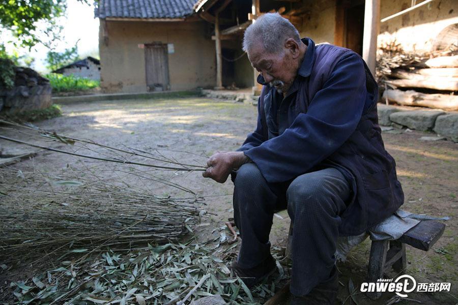 5月23日,陜西省漢中市寧強縣鐵鎖關(guān)鎮(zhèn)周家坎村半山腰上,106歲的老壽星王春云在土坯房前將一根根竹枝上的葉子摘掉擺放整齊準(zhǔn)備綁掃把。(記者 魏永賢)圖片來源:西部網(wǎng)
