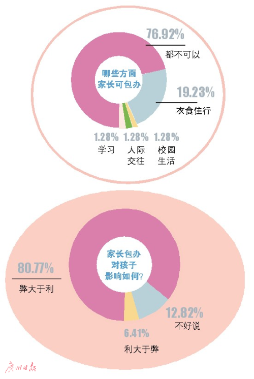 日前,本報在網(wǎng)上對“家長包辦”這一話題進行了調(diào)查,發(fā)現(xiàn)在以家長為主的受訪者中,有超過八成的人認為家長包辦“弊大于利”,然而在現(xiàn)實中,許多家長卻意識不到自己的行為是“包辦”。不僅孩子們不喜歡,也有不少因為家長愛“包辦”而感到郁悶的老師。教育專家表示,家長包辦、干預(yù)、照顧得太多,對孩子的成長會造成較大的負面影響,容易高分低能。因此,在孩子成長的每一個階段,家長都應(yīng)該適時放手。