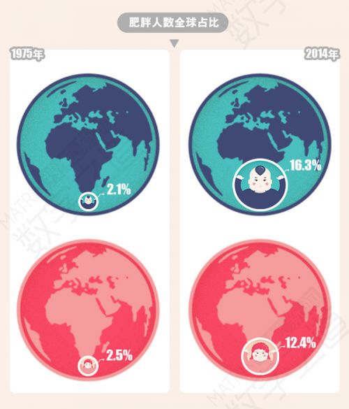 全球肥胖人數(shù)從1975年1億多增加到2014年的6.41億,中美兩國(guó)分別以8960萬(wàn)和8780萬(wàn)位列第一和第二。當(dāng)?shù)谝灰彩且驗(yàn)槲覀內(nèi)硕,中?guó)有13.7億人,美國(guó)僅有3.2億,按比例算還是美國(guó)贏。