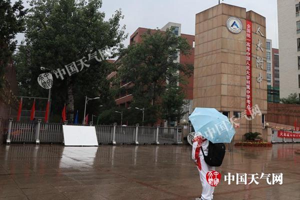 6日清早,北京下起小雨,考生冒雨熟悉考場。(圖/李。