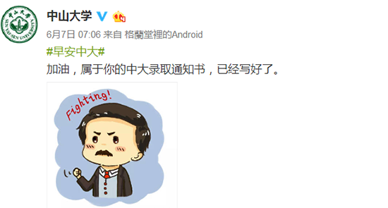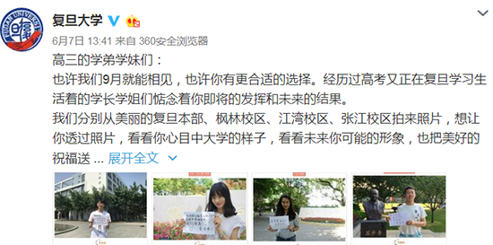 人民網(wǎng)北京6月8日電 一年一度的高考鐘聲已于昨日再次在全國各地敲響,940萬考生在火熱的六月迎戰(zhàn)生命中一場重要的考驗(yàn)。值此之際,北京大學(xué)、人民大學(xué)、復(fù)旦大學(xué)、武漢大學(xué)等高校紛紛通過官方微博為高考考生獻(xiàn)上祝福和鼓勵(lì):愿你沉著自信奔赴戰(zhàn)場,祝你旗開得勝金榜題名,我們在大學(xué)等你!