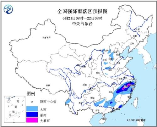 全國強(qiáng)降雨落區(qū)預(yù)報圖(6月21日08時-22日08時)