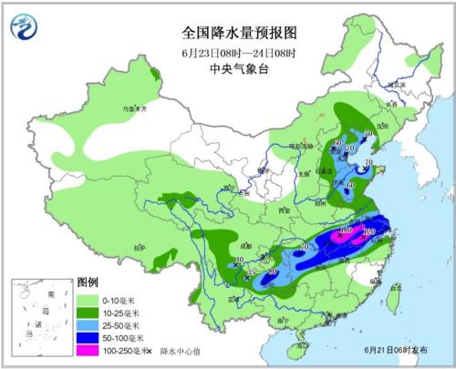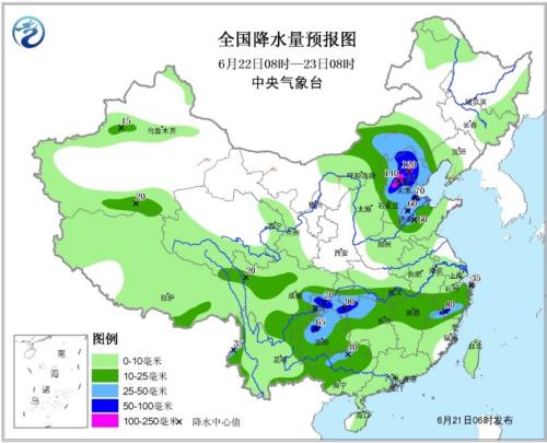 全國降水量預(yù)報圖(6月21日08時-22日08時)