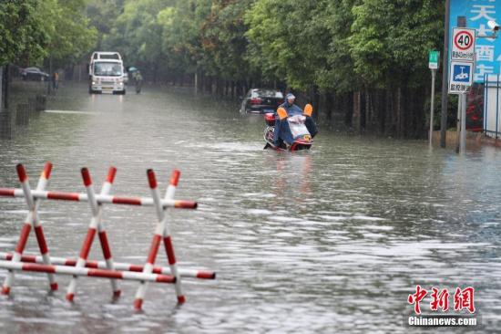 資料圖:6月12日,貴陽(yáng)市民騎電動(dòng)車在積水路段行駛。中新社記者 賀俊怡 攝