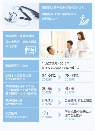 5年來,我國(guó)健康水平持續(xù)改善,居民主要健康指標(biāo)總體上優(yōu)于中高收入國(guó)家平均水平,人均期望壽命從2010年的74.83歲上升至2016年的76.34歲。較高的健康績(jī)效,為全面建成小康社會(huì)奠定了重要基礎(chǔ)。世界銀行、世界衛(wèi)生組織認(rèn)為,中國(guó)在實(shí)現(xiàn)全民健康覆蓋方面迅速邁進(jìn),改革成就舉世矚目。
