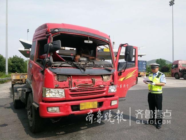 不一會(huì)兒,民警便發(fā)現(xiàn)這輛非同尋常的貨車,并將其引導(dǎo)下收費(fèi)站接受檢查。一看,這輛車問題還真不少,除了沒有前擋風(fēng)玻璃,車頭前部保險(xiǎn)杠和大燈都被撞的不成樣子。原來該車在濰坊某地遇追尾事故,因事故案發(fā)地人生地不熟,便聯(lián)系了一家濟(jì)寧本地的汽修廠。事故處理完畢后,該車駕駛員不顧辦案民警勸阻,徑自將無擋風(fēng)玻璃的事故車開上了高速。