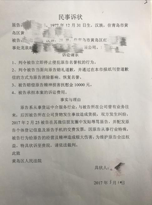 今年3月份青島市黃島區(qū)人民法院受理了一起案件,起因是孫某與張某在工作中因一批貨物受損而產(chǎn)生矛盾,隨后張某就在自己的微信朋友圈發(fā)布消息辱罵孫某,并附上了孫某的個(gè)人信息。事情發(fā)生后,孫某認(rèn)為張某侵犯了自己的合法權(quán)益。隨后,孫某將張某告上法庭,要求其停止侵權(quán),當(dāng)面向自己賠禮道歉,恢復(fù)名譽(yù),并做出賠償。