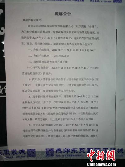 北京“動批”眾合市場26日貼出正式疏解公告。圖為疏解公告。公告中稱,市場于2017年7月30日16時停止?fàn)I業(yè)!≡ 攝