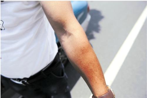 來自安徽的劉士成,是一名資深的哥,40多歲的他,在下沙開出租車已有10年之久,行駛的路程共計(jì)有53萬多公里!拔乙惶熘辽10個(gè)小時(shí)在車上,左胳膊靠著車窗,天天曬。右胳膊離窗戶遠(yuǎn)些,就還好,時(shí)間一長就成這樣啦!眲煾嫡f著,有點(diǎn)無奈地亮出自己格外明顯的“陰陽手”。